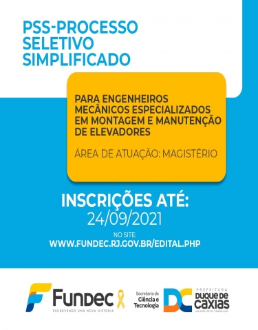 FUNDEC ABRE EDITAL PARA QUALIFICAÇÃO EM INSTALAÇÃO E MONTAGEM DE ELEVADORESA Prefeitura de Duque de Caxias em parceria com a Secretaria Municipal de Ciência e Tecnologia, por meio da Fundec, promove o curso de qualificação profissional em instalação e montagem de elevadores.