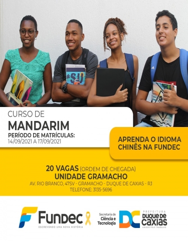 FUNDEC OFERECE NOVAS VAGAS PARA O CURSO GRATUITO DE MANDARIM A Prefeitura de Duque de Caxias, em parceria com a Secretaria Municipal de Ciência e Tecnologia, oferece por meio da Fundec 20 novas vagas para o curso gratuito de Mandarim, idioma falado na China e um dos mais usados na atualidade, na unidade do Gramacho.