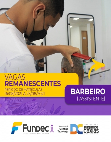 FUNDEC ABRE NOVAS TURMAS PARA CURSO DE BARBEIRO ASSISTENTE A Prefeitura de Duque de Caxias e a Secretaria Municipal de Ciência e Tecnologia, por meio da Fundec, oferecem 30 vagas em duas novas turmas para o curso de Barbeiro Assistente no Polo da Indústria (Av. Doutor Manoel Reis, 881 - Centenário, Duque de Caxias): terça-feira de 13h às 17h e terça-feira de 18h às 22h, com início das aulas em 24/08.