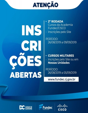 A Prefeitura de Duque de Caxias, por meio da Fundec, divulgou nesta segunda-feira (02/09), o edital de acesso aos cursos Instrumentais e de Formação Inicial e Continuada ou Qualificação Profissional e Oficinas. As inscrições iniciam no dia 09 e se encerram em 18/09. As aulas terão início no dia 07/10.