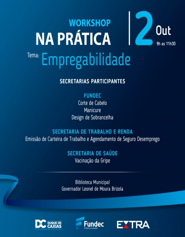 WORKSHOP NA PRÁTICA - EMPREGABILIDADEO terceiro Workshop Na Prática, promovido pela Prefeitura de Duque de Caxias, pela FUNDEC e pelo Jornal Extra, vai reunir profissionais experientes de RH com dicas importantes, além de histórias inspiradoras e informações sobre o cenário atual do mercado de trabalho.