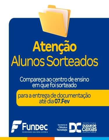ATENÇÃO ALUNOS SORTEADOS PARA OS CURSOS GRATUITOSEstá aberto o período para entrega de documentação e confirmação de matrícula para os estudantes sorteados nos cursos presenciais. Será possível realizar a conclusão do cadastro de 01 a 07/02, se atente ao prazo!