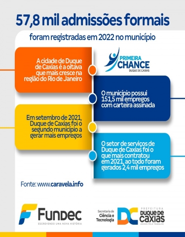 De acordo com o sistema de Cadastro Geral de Empregados e Desempregados (Caged), em setembro de 2021, Duque de Caxias foi o segundo município a gerar mais empregos. Dando continuidade ao trabalho em prol da população, em 2022 foram registradas 57,8 mil admissões formais.