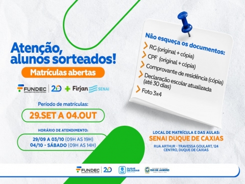 PREFEITURA DE DUQUE DE CAXIAS ABRE PORTAS PARA O FUTURO COM CURSOS DE QUALIFICAÇÃO PROFISSIONAL FUNDEC/SENAI-RJA manhã desta quinta-feira (09/10) marcou o início de uma nova jornada para centenas de alunos em Duque de Caxias. A Aula Inaugural dos cursos de qualificação profissional promovidos pela Fundação de Apoio à Escola Técnica, Ciência, Tecnologia, Esporte, Lazer, Cultura e Políticas Sociais (FUNDEC) aconteceu no Teatro SESI/SENAI, reunindo os novos estudantes contemplados para integrarem as turmas de Almoxarife, Assistente de Controle de Qualidade, Assistente de Operações em Logística, Eletricista Predial, Instrumentação Industrial e Mecânico de Manutenção. A iniciativa é fruto da parceria entre a Prefeitura de Duque de Caxias, por meio da FUNDEC, e o SENAI-RJ, com o objetivo de gerar oportunidades de inserção no mercado de trabalho.