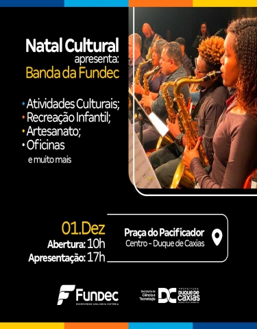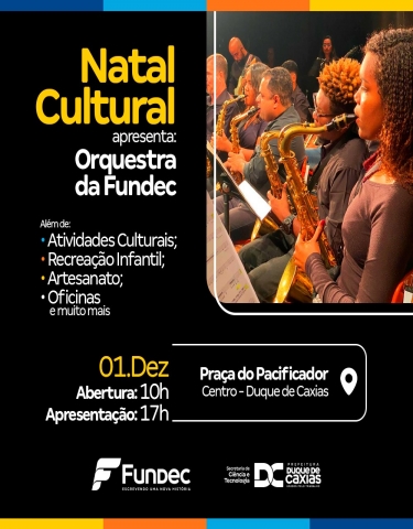 NATAL CULTURAL APRESENTA ORQUESTRA DA FUNDEC Nesta quinta-feira (01) a Prefeitura de Duque de Caxias, através da Secretaria Municipal de Cultura e Turismo (SMSCT) e parceiros, fará a abertura do projeto Natal Cultural, na Praça do Pacificador, das 10 às 19h. O mês será marcado por uma série de atividades que estarão à disposição da população, de forma gratuita, em celebração ao Natal, nos dias 1, 2, 12 e 20 de dezembro.