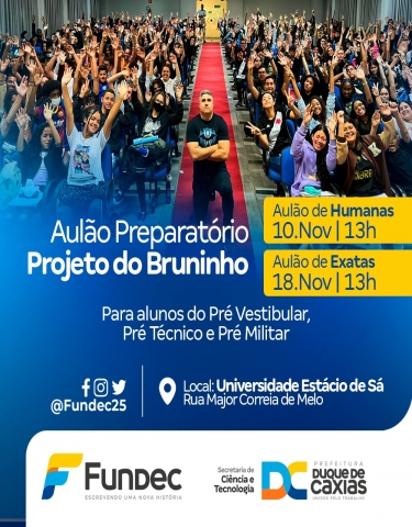 FUNDEC CONVIDA ALUNOS DO PREPARATÓRIO PARA AULÃO COM PROJETO DO BRUNINHO Na próxima quinta-feira (10), a Fundec, em parceria com o Projeto do Bruninho, irá realizar um aulão de humanas para os alunos do preparatório, na Universidade Estácio, a partir das 13h.