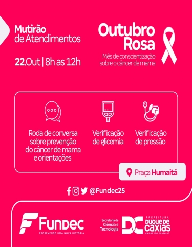 FUNDEC DÁ CONTINUIDADE ÀS AÇÕES DO OUTUBRO ROSA No próximo sábado (22), a partir das 8h, a Fundec irá realizar mais uma mobilização referente à campanha do Outubro Rosa - mês de conscientização e prevenção ao câncer de mama.