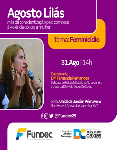 FUNDEC REALIZA PALESTRA SOBRE FEMINICÍDIOA Fundec convida para a palestra sobre feminicídio, no dia 30/08, a partir das 14h, na unidade de Jardim Primavera. A ação faz parte da campanha do Agosto Lilás, mês de conscientização pelo combate à violência contra a mulher.