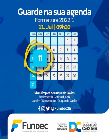 CHEGOU A HORA DE CONCLUIR MAIS UMA ETAPA ACADÊMICA Na próxima segunda-feira (11), a Prefeitura de Duque de Caxias, por meio da secretaria municipal de ciência e tecnologia, vai realizar a cerimônia de formatura, com o objetivo de concluir mais uma etapa profissional na vida dos estudantes.